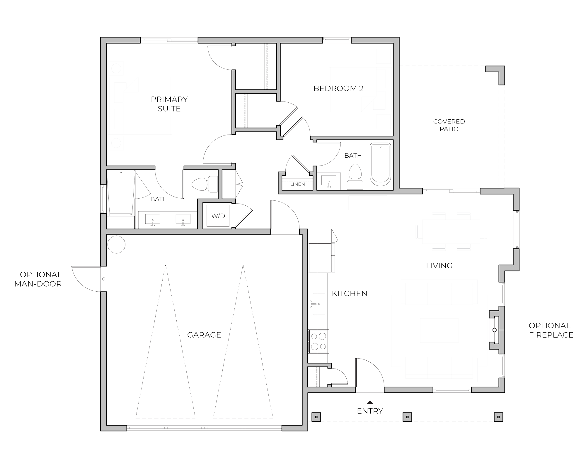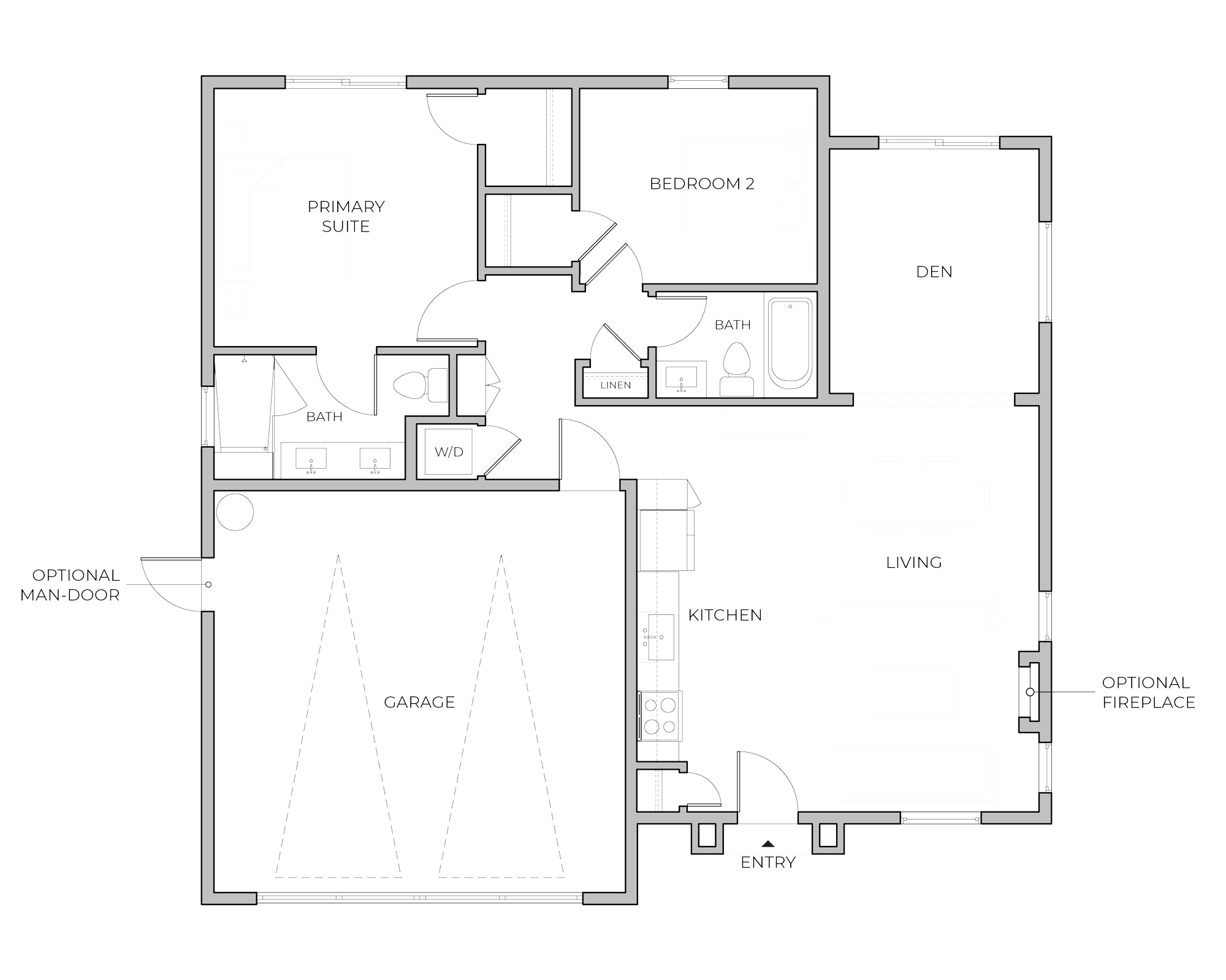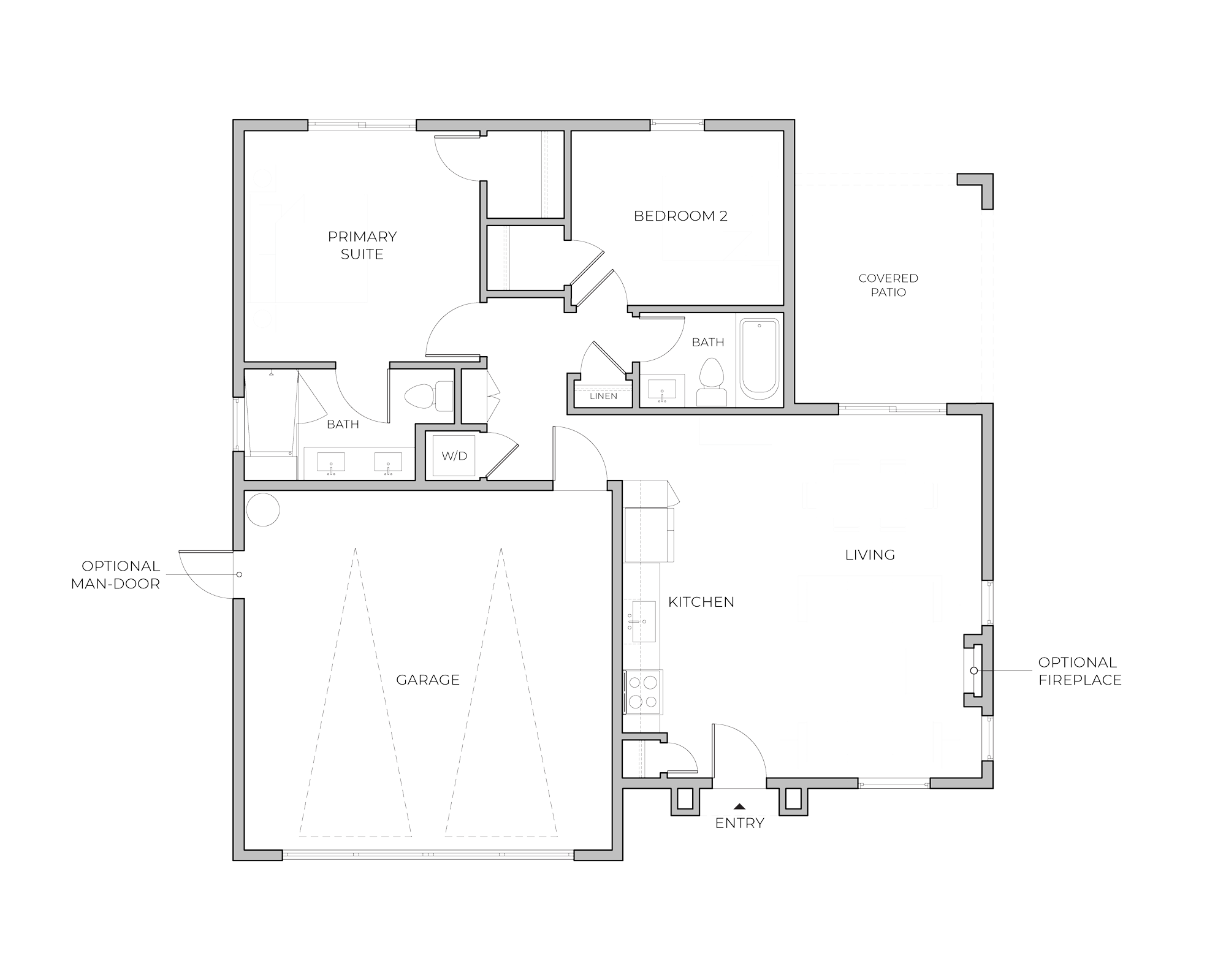 Optional fireplace, optional bedroom 2 slider, and optional garage side-yard door
