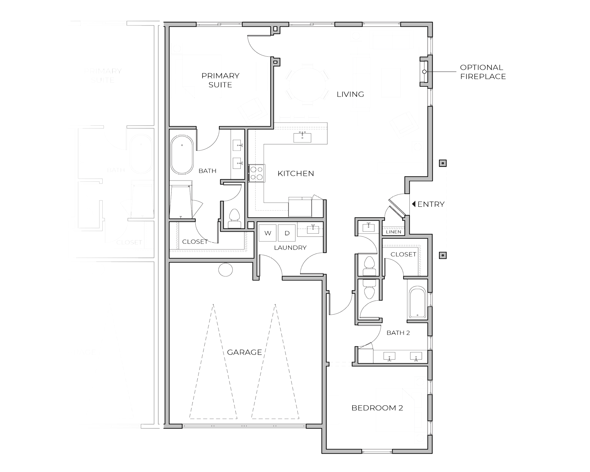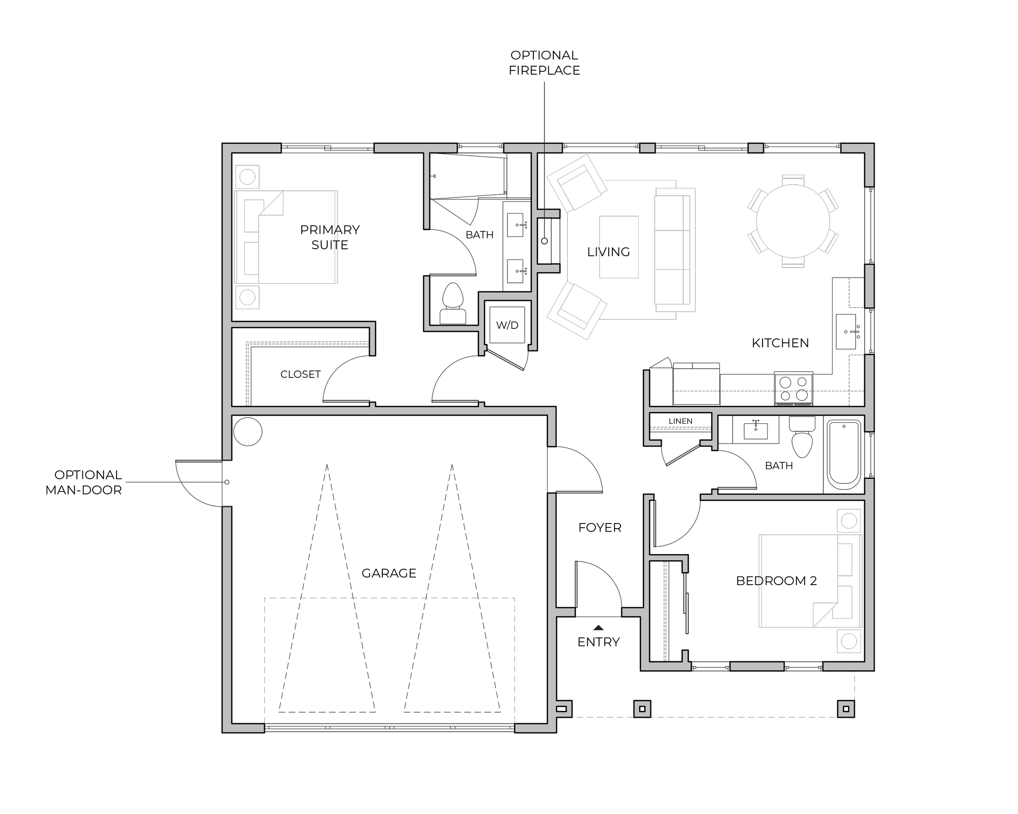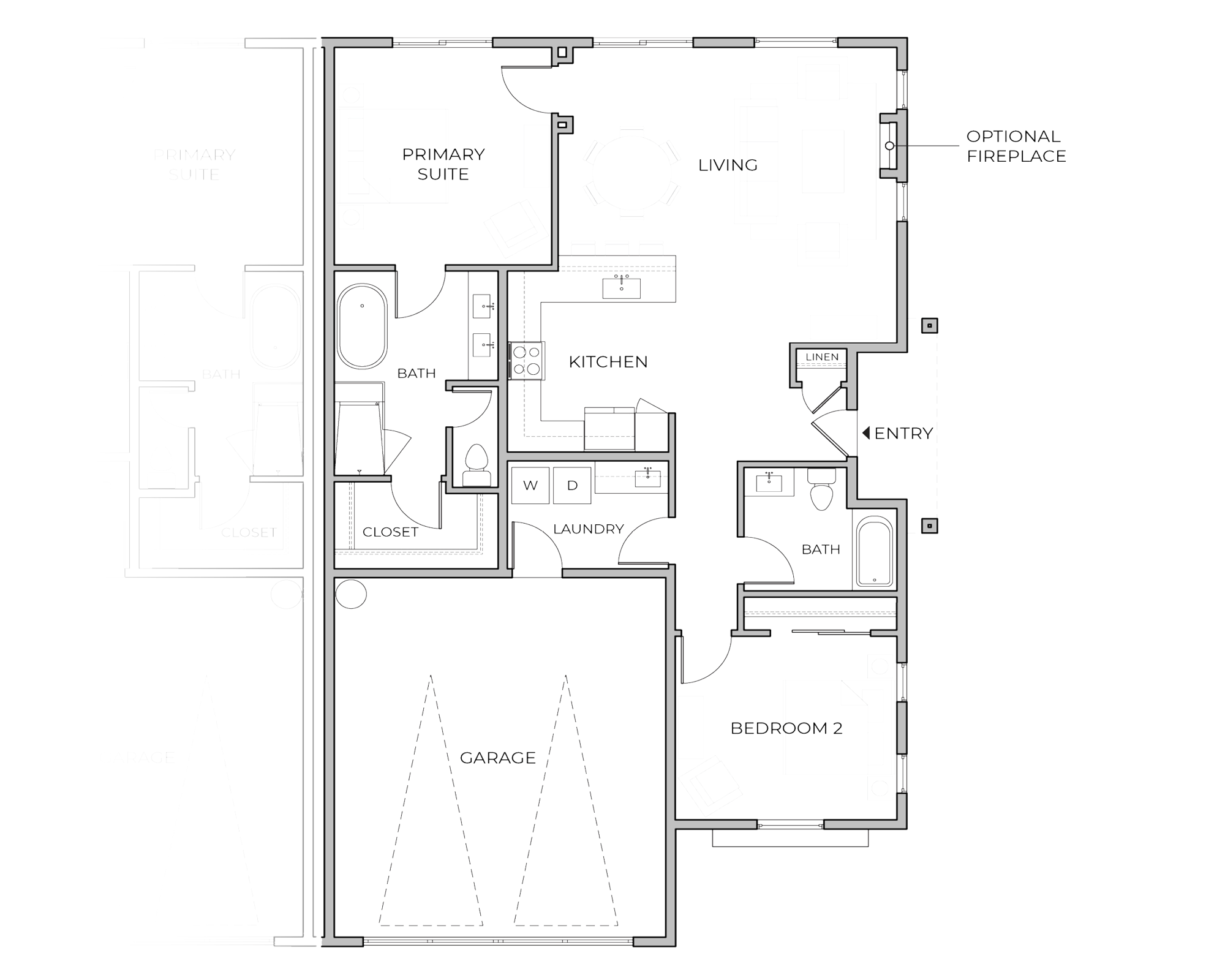 Optional fireplace, optional bedroom 2 slider, and optional garage side-yard door